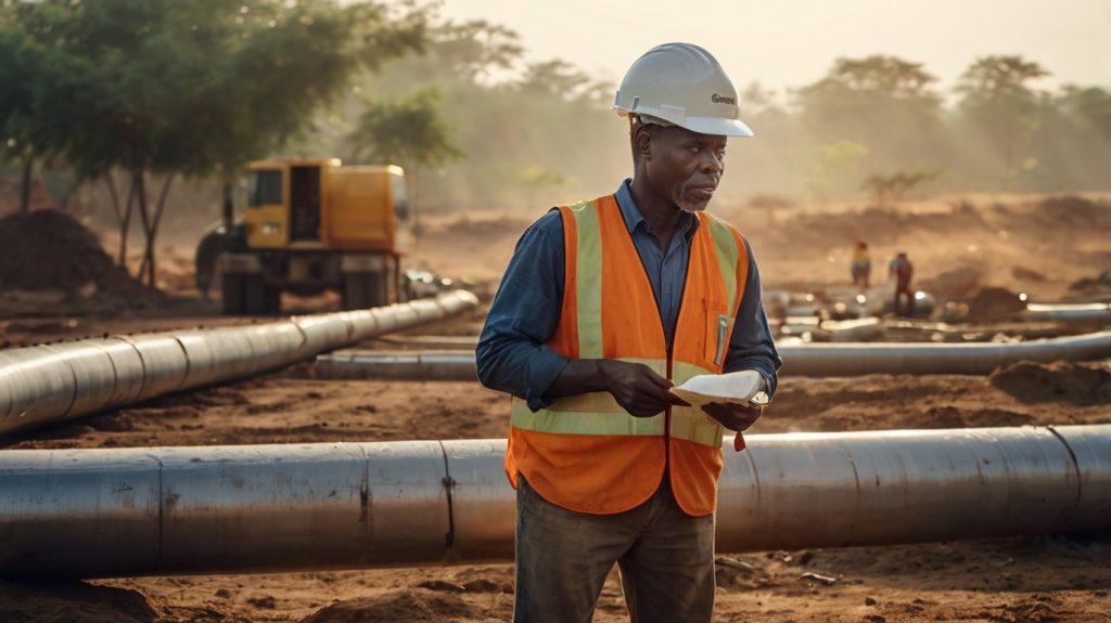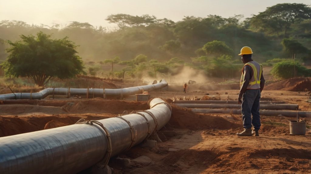 Excavate, lay pipes in trenches and backfilling for 5km Transmission main and 38km Distribution main. Supply and installing pipes, valves, fittings and specials. Water Storage Tank-1500m3 and Drilling Bore holes with Q=50m3/h